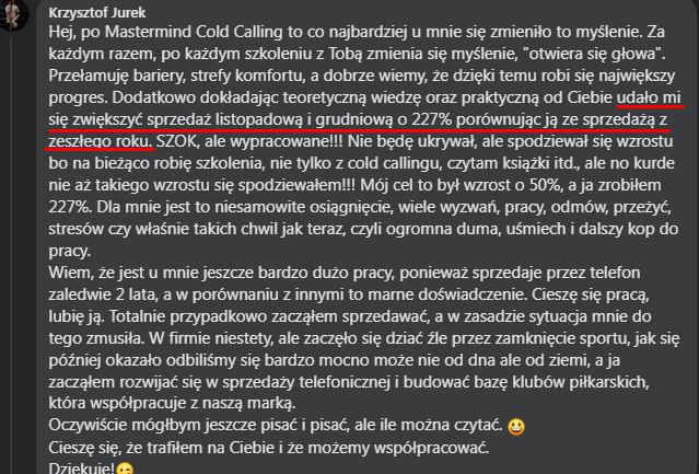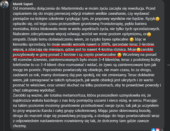 "(...) Od momentu dołączenia do mastermindu w moim życiu zaczęła się rewolucja... Moje wyniki wzrosły nawet o 300%, sprzedaję teraz 3-krotnie więcej, a zdarzają się miesiące, gdzie jest to nawet 4-krotna różnica"
