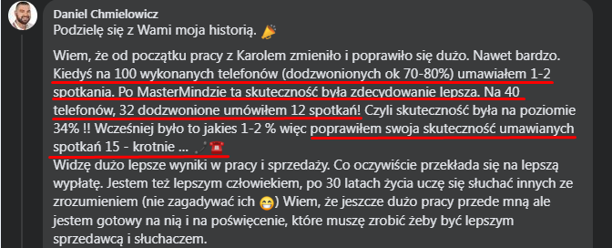 "(...) Kiedyś na 100 wykonanych telefonów umawiałem 1-2 spotkania. Po mastermindzie skuteczność była zdecydowanie lepsza. Na 40 telefonów umówiłem 12 spotkań. Poprawiłem swoją skuteczność umawianych spotkań 15-krotnie."