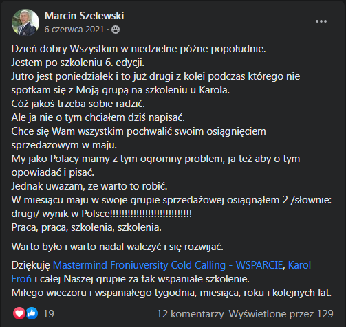 "(...) Jestem po szkoleniu 6 edycji... Chcę się Wam wszystkim pochwalić swoim osiągnięciem sprzedażowym... W miesiącu maju w swojej grupie sprzedażowej osiągnąłem 2 / słownie: drugi / wynik w Polsce !!!!!!"